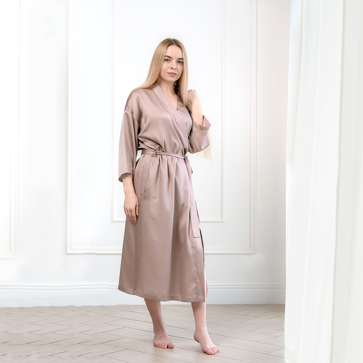 Модель: халат-кимоно, завязывается поясом на запах, имеет внутренние завязки и карманы в швах