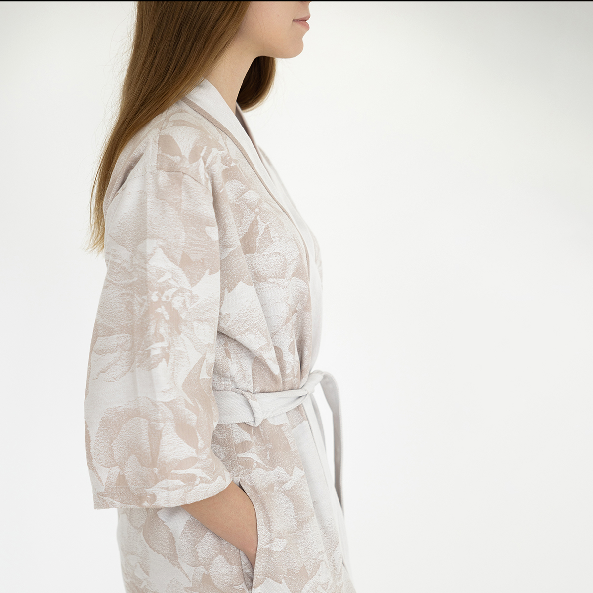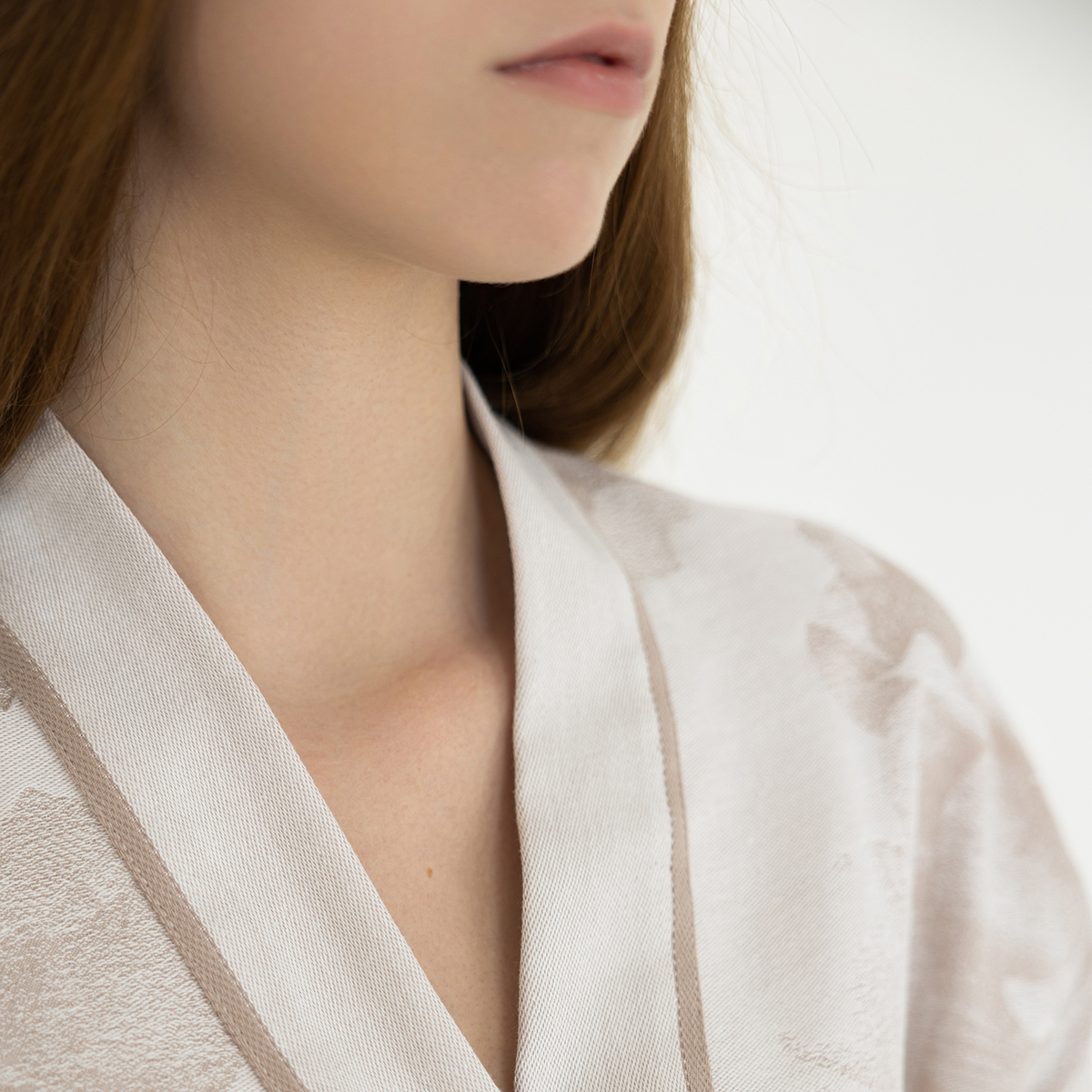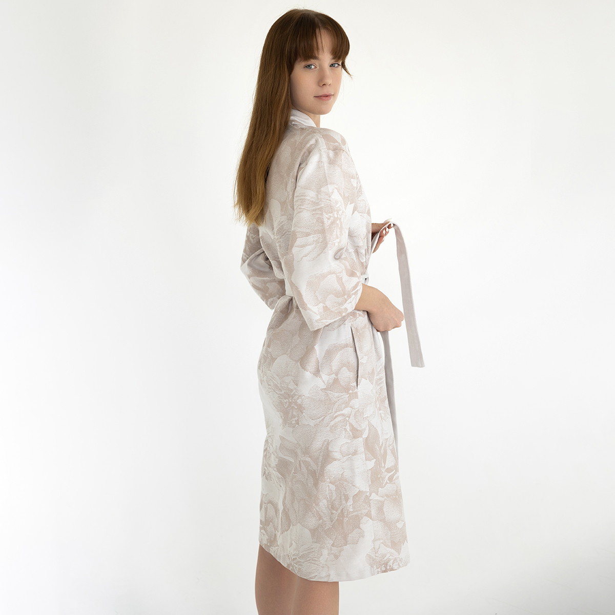 Пралине - универсальный и спокойный нюдовый оттенок, идеальная классика. Жаккардовый узор на халате повторяет принт постельного белья Федерика.