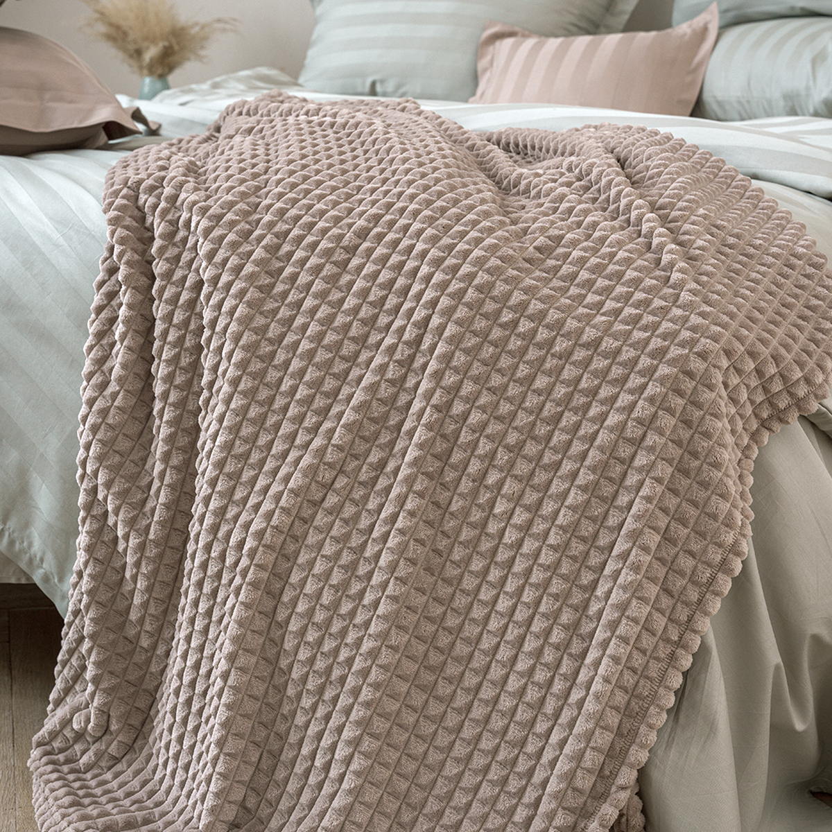 Плед Капучино, теплый и, по-настоящему, вкусный оттенок, он создает положительные ассоциации, придает помещению элегантный вид. Нежный кофейно-молочный оттенок помогает создать атмосферу тишины, покоя, он всегда актуален и популярен, кроме того, он отлично сочетается с различными стилями.