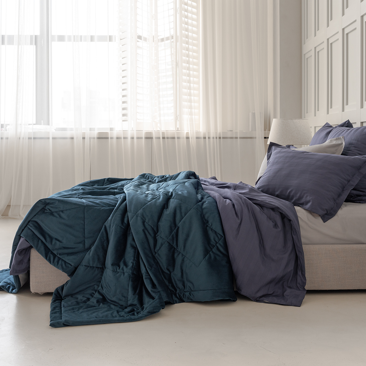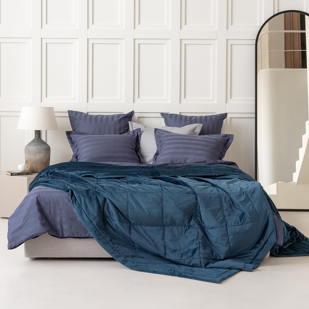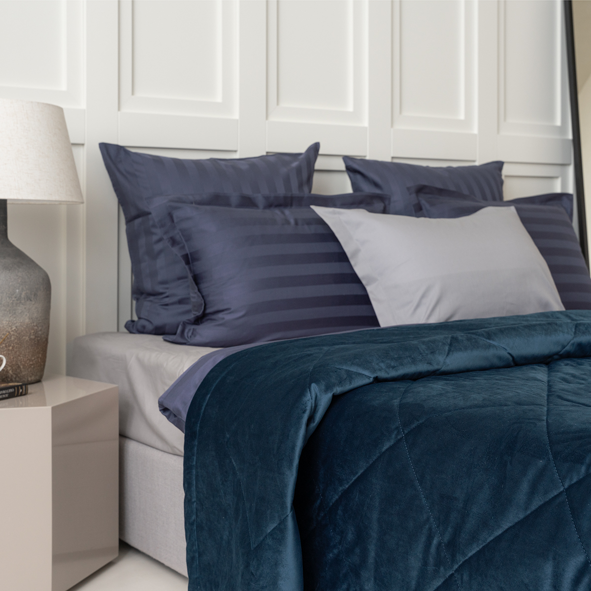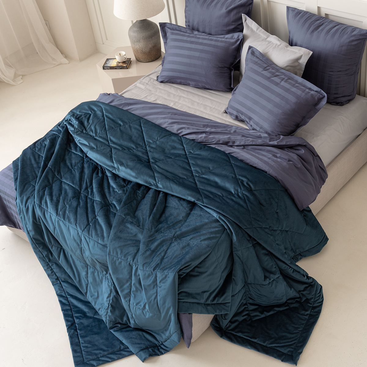 Состав: бархат 100% пэ, наполнитель - полиэфирное волокно. Подклад покрывала – микрофибра велюр, за счет своей фактуры он предотвращает скольжение покрывала на кровати. Стежка в виде ромбов.