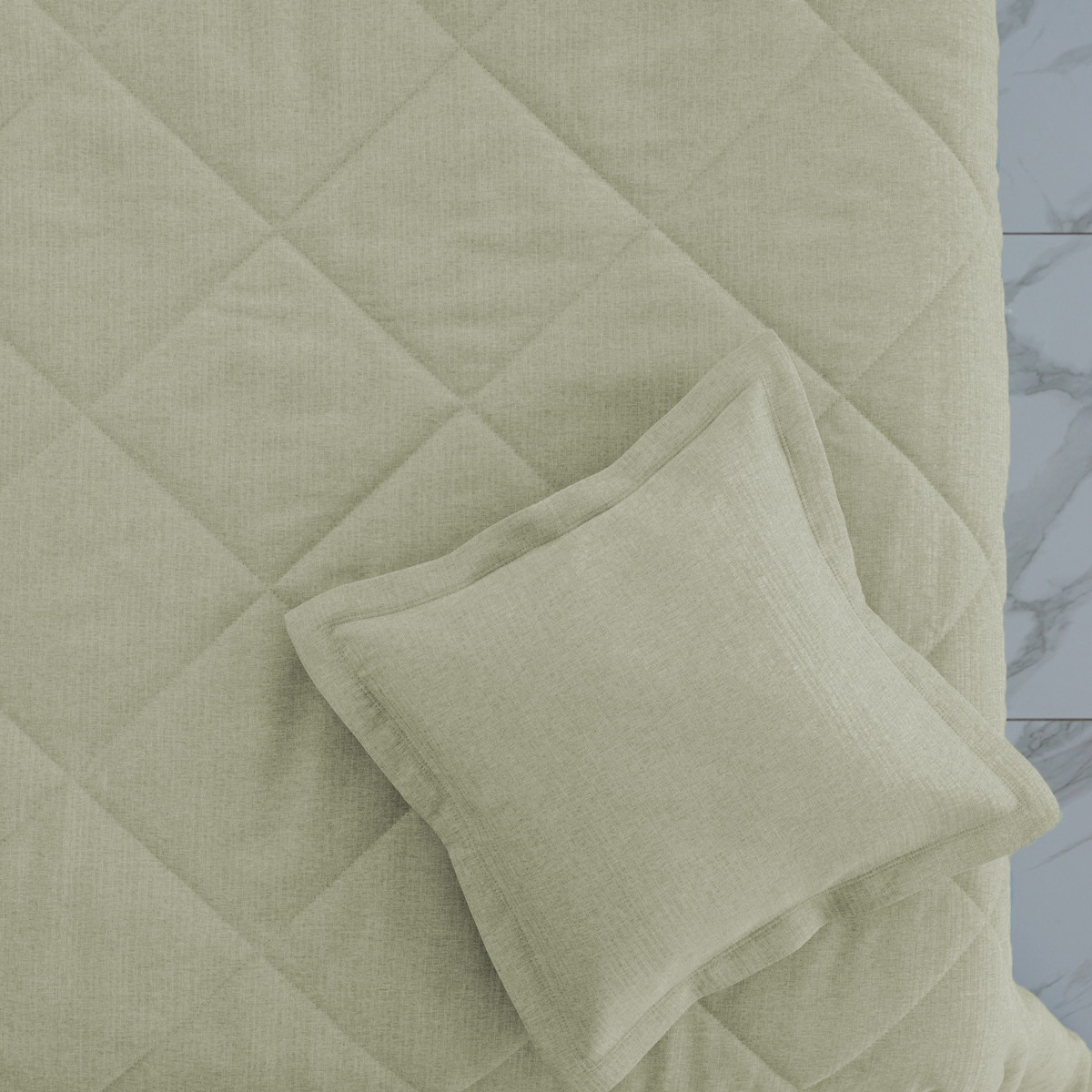 В комплект входит: стеганое покрывало на подкладе размер 220х240 см и 2 декоративные наволочки 45х45 см на молнии. Наволочки с четырех сторон декорированы ушками шириной 4 см.