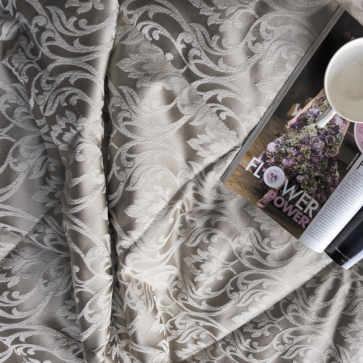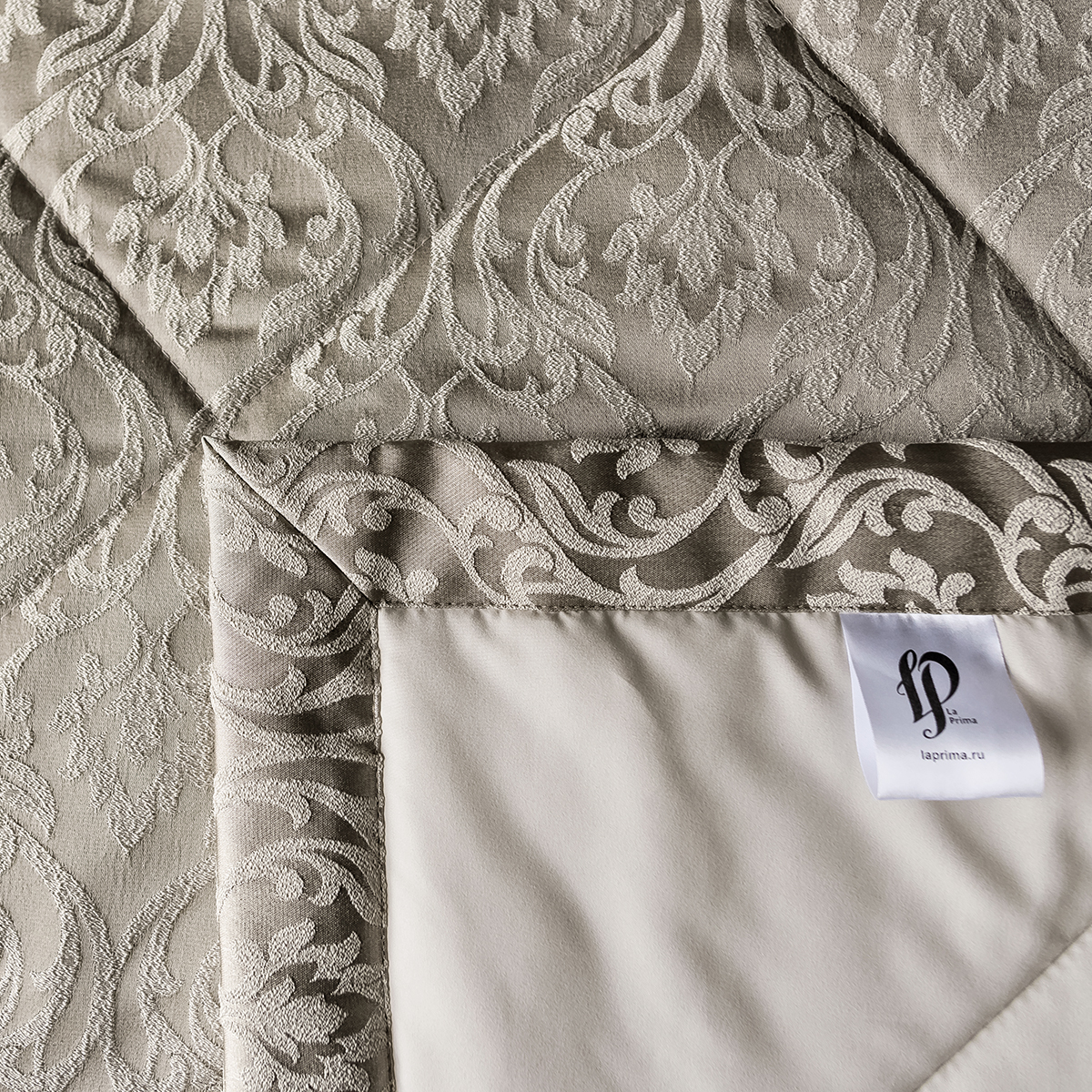 Состав: ткань портьерная 100% пэ, наполнитель - полиэфирное волокно. Стежка в виде ромбов. Подклад покрывала – микрофибра велюр, за счет своей фактуры он предотвращает скольжение покрывала на кровати.