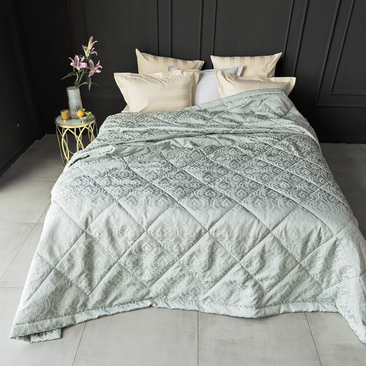 Состав: ткань портьерная 100% пэ, наполнитель - полиэфирное волокно. Стежка в виде ромбов. Подклад покрывала – микрофибра велюр, за счет своей фактуры он предотвращает скольжение покрывала на кровати.