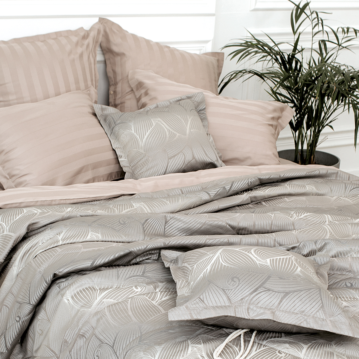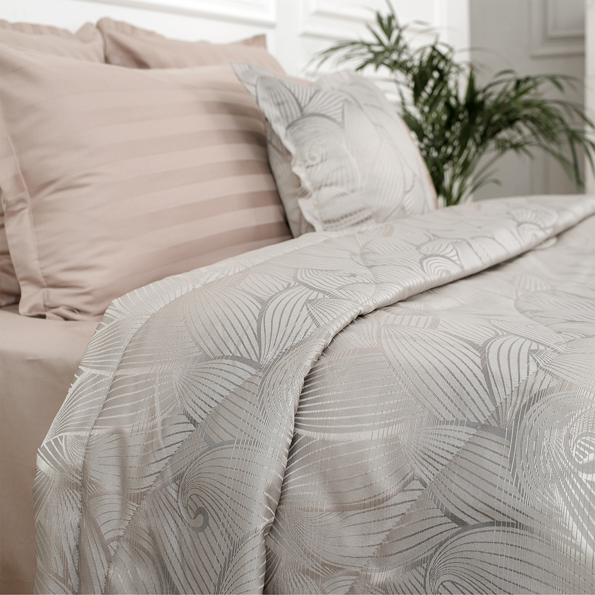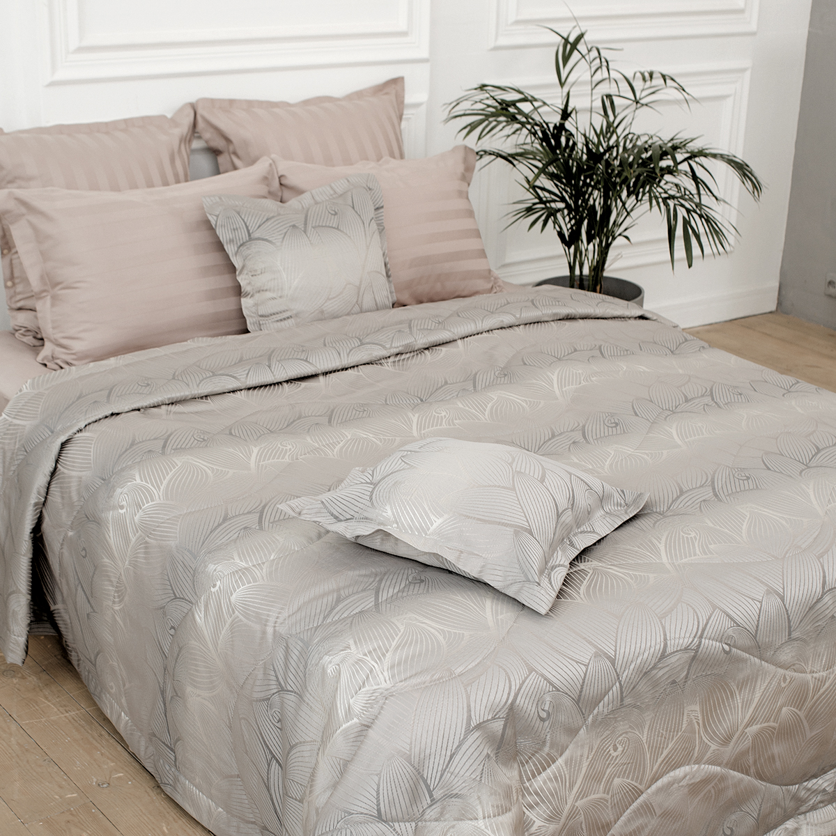 В комплект входит: стеганное покрывало на подкладе размер 240*260 см и 2 декоративные наволочки 45х45 см на молнии. Наволочки с четырех сторон декорированы ушками шириной 3 см.