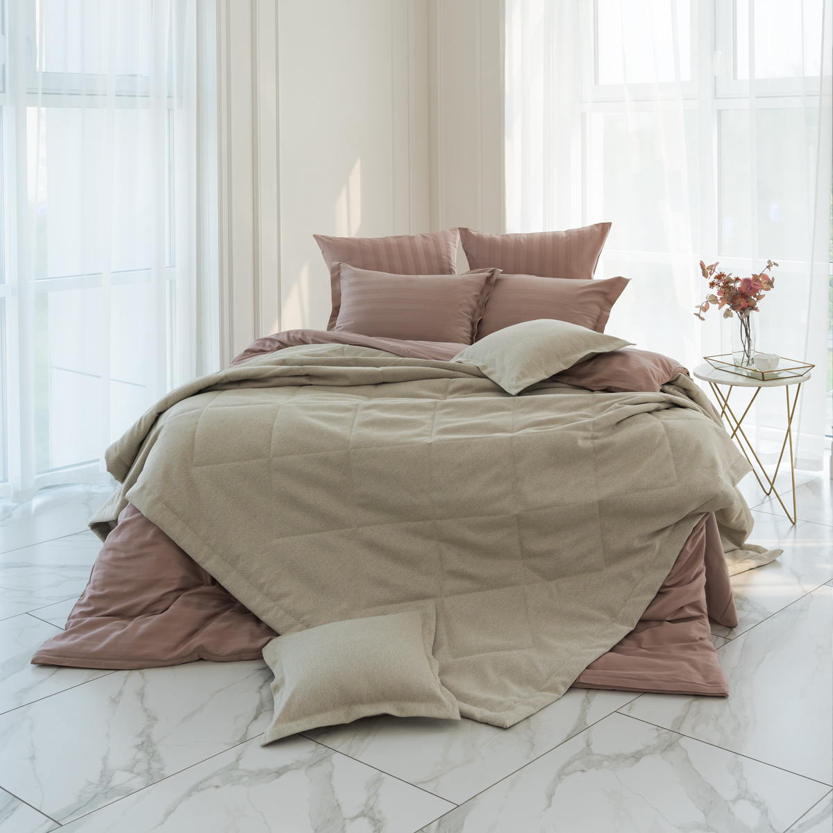 В комплект входит: стеганое покрывало на подкладе размер 240х260 см и 2 декоративные наволочки 45х45 см на молнии. Наволочки с четырех сторон декорированы ушками шириной 4 см.