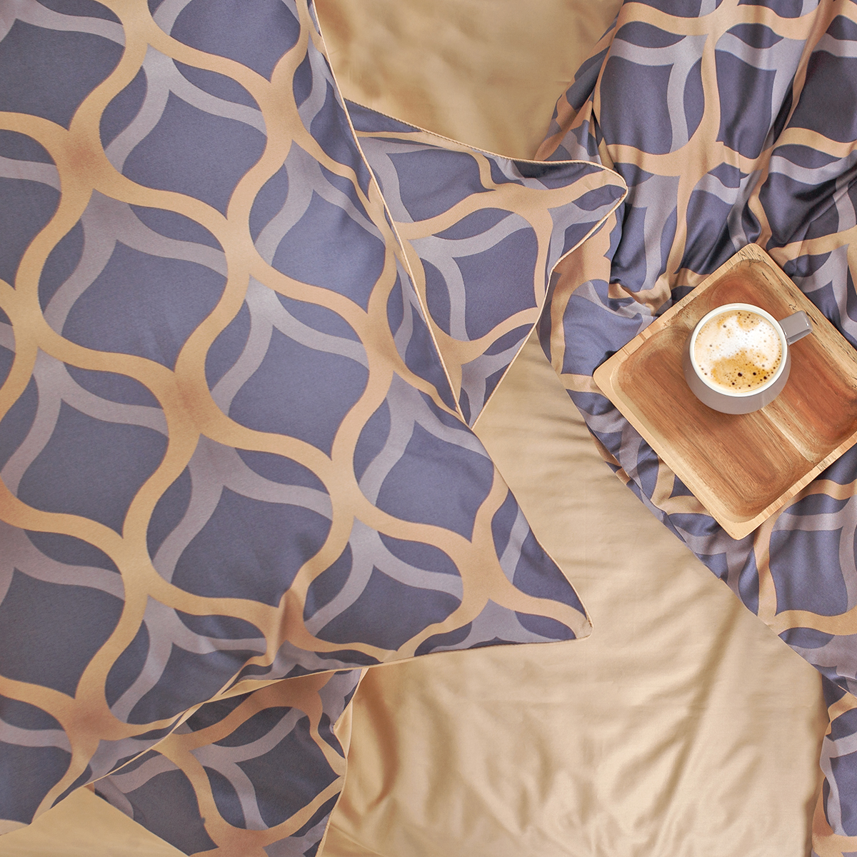 - Наволочки двухсторонние: лицевая сторона – орнаментальный принт, оборотная – однотонная. Декоративный кант по трем сторонам наволочки. Широкий запах на наволочках - легко менять подушки.