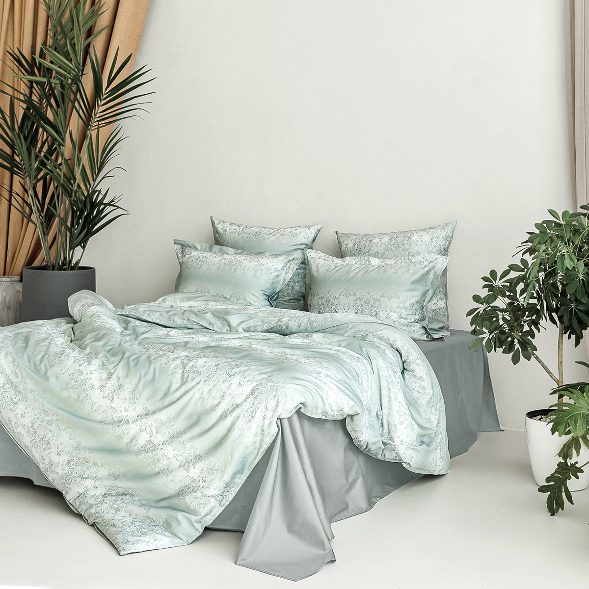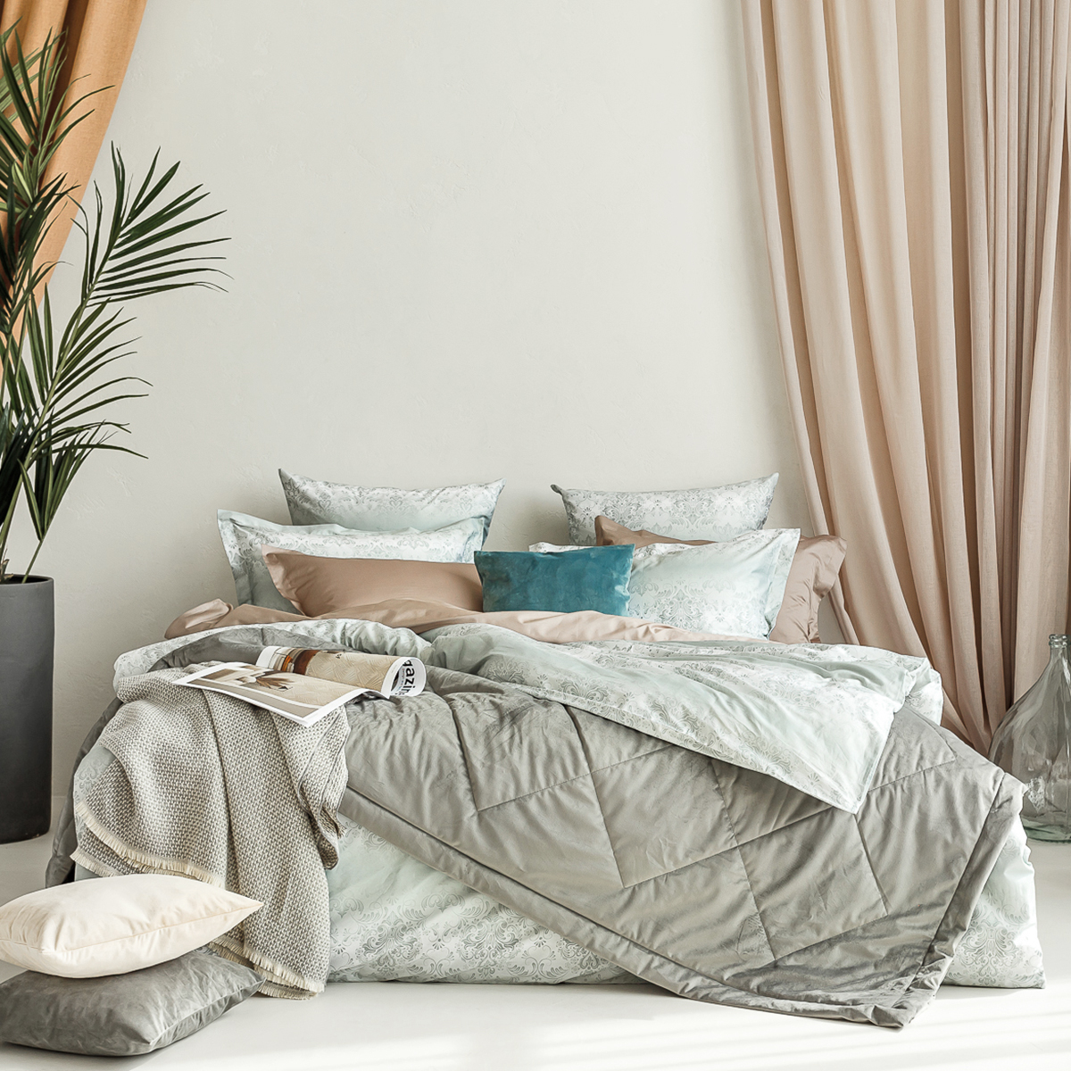 В ткани мако-сатин, из которой произведена коллекция, используется более тонкая 60-я нить. Плотность ткани 300 ТС. За счет специальной скрутки нити, ткань получается очень мягкая и приятная на ощупь.