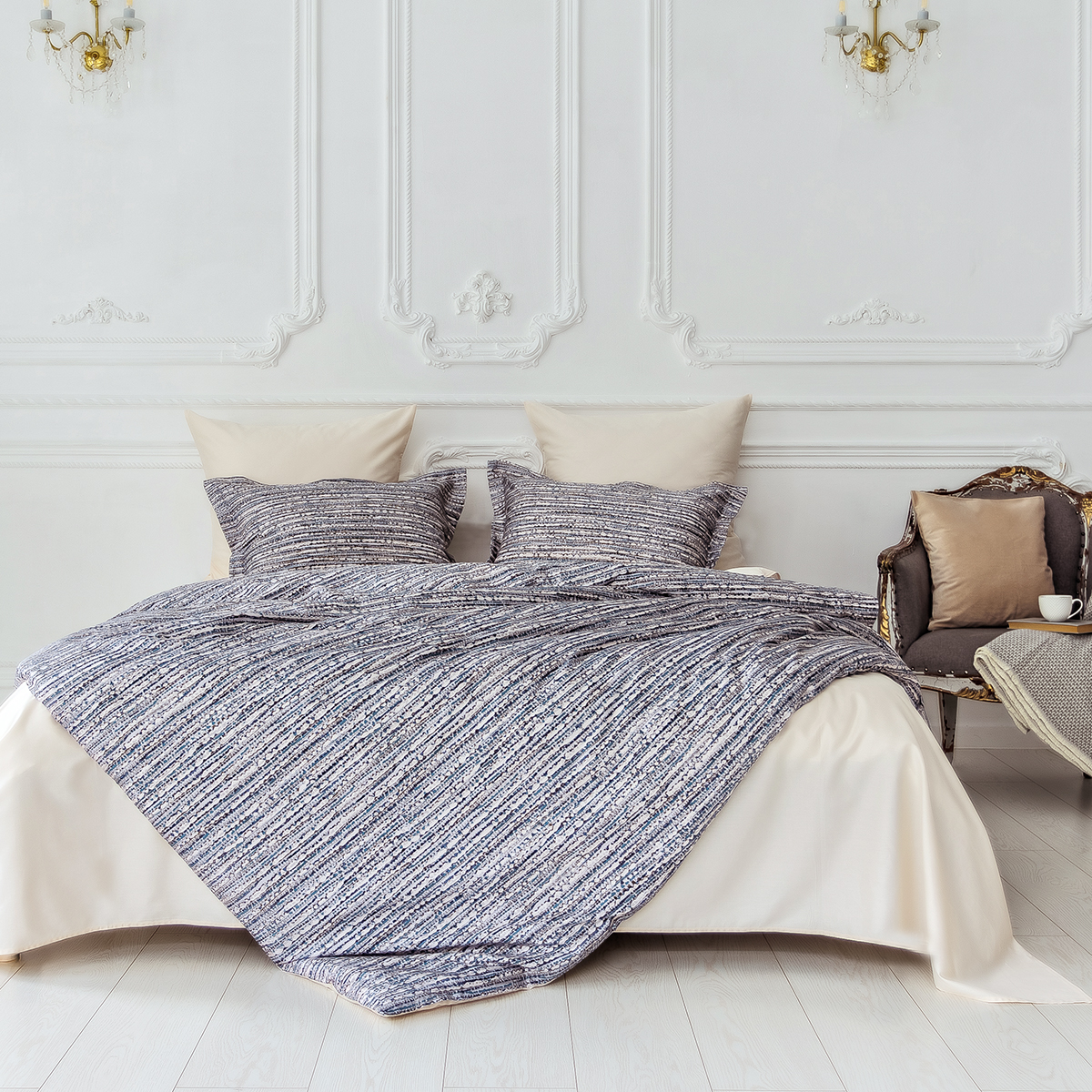«Данте» - изысканный текстурный узор напоминает спокойное море, чьи волны мягко перекатываются под легким ветром. Тонкие, плавные линии в сине-белой гамме создают ощущение глубины и умиротворения, идеально подходя для современного интерьера. Сдержанная палитра и минималистичный дизайн добавляют спальне уют и элегантность, не перегружая пространство.