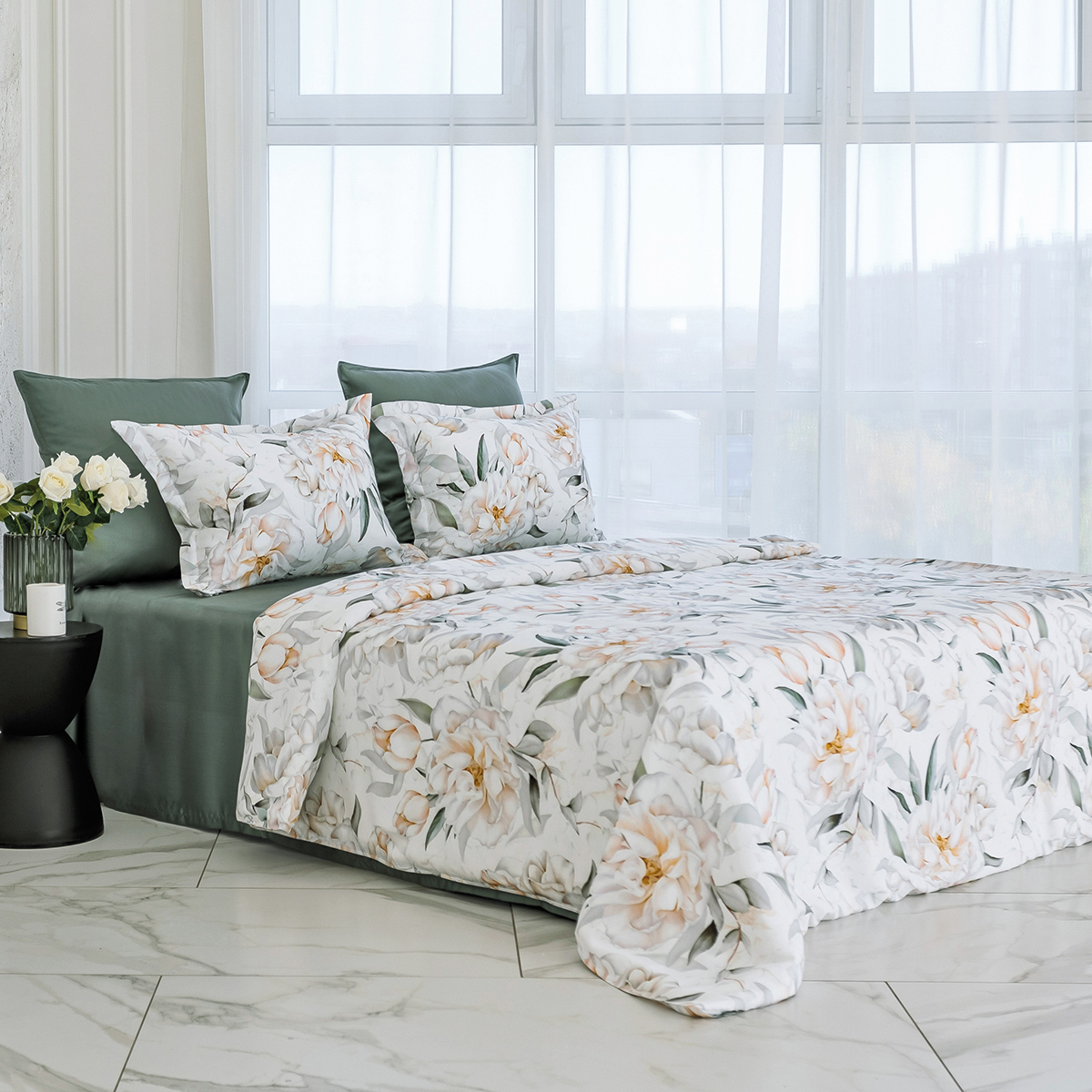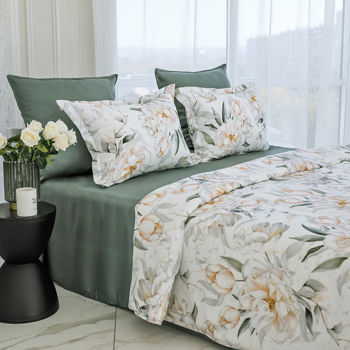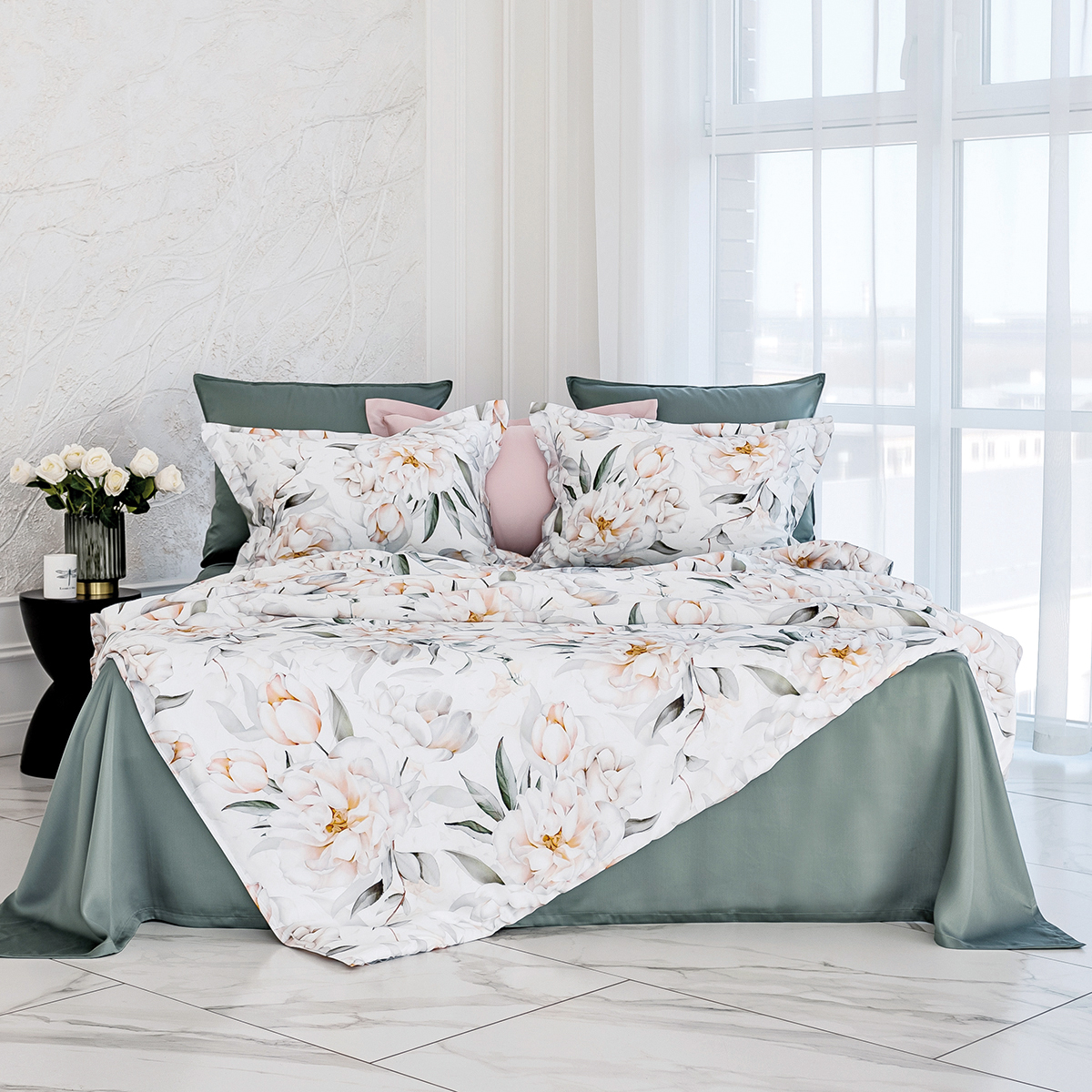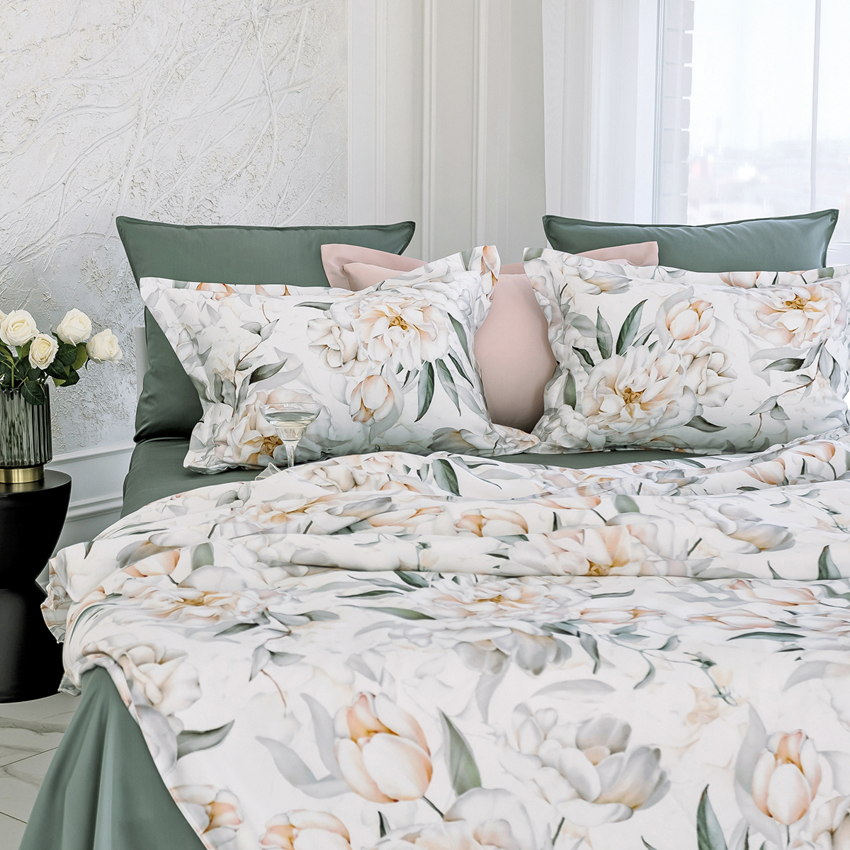 Мягкие переливы цвета пионов откроют в вашей спальне идеальные условия для комфортного сна и отдыха. Этот элегантный комплект сочетает в себе утонченность белого и естественность зелёного, наполняя пространство уютом и легкостью.