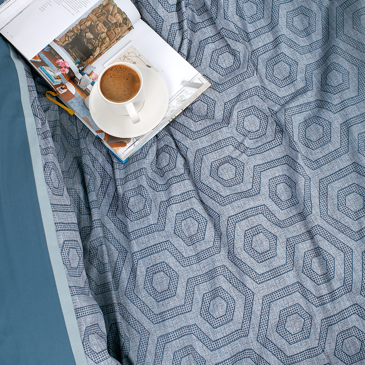 Смелый и дерзкий... Ультрамодная игра сочетаний: стильный геометрический орнамент, замысловатая архитектура ломанных линий и форм удачно подчеркивает стиль и лаконичность современного интерьера. Особую брутальность комплекту придают глубокие и насыщенные лазурно-изумрудные оттенки.