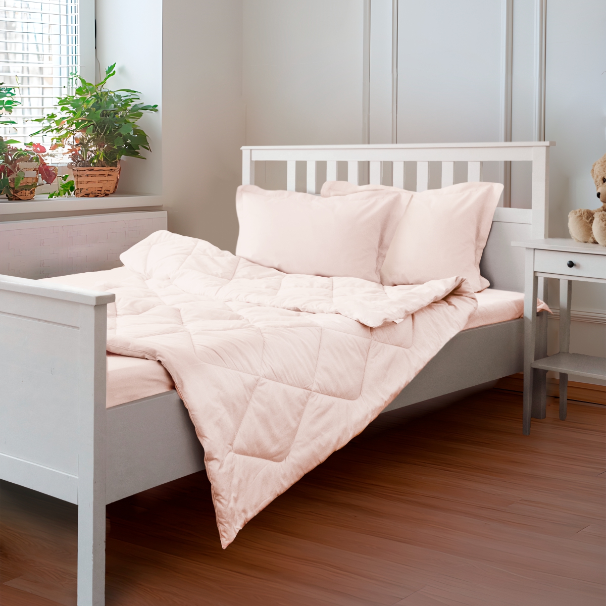 За постельным бельем с одеялом легко ухаживать, его можно стирать в стиральной машине, оно выдерживает до 500 стирок.