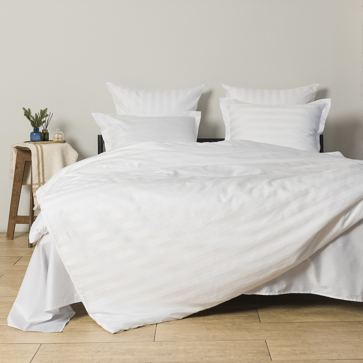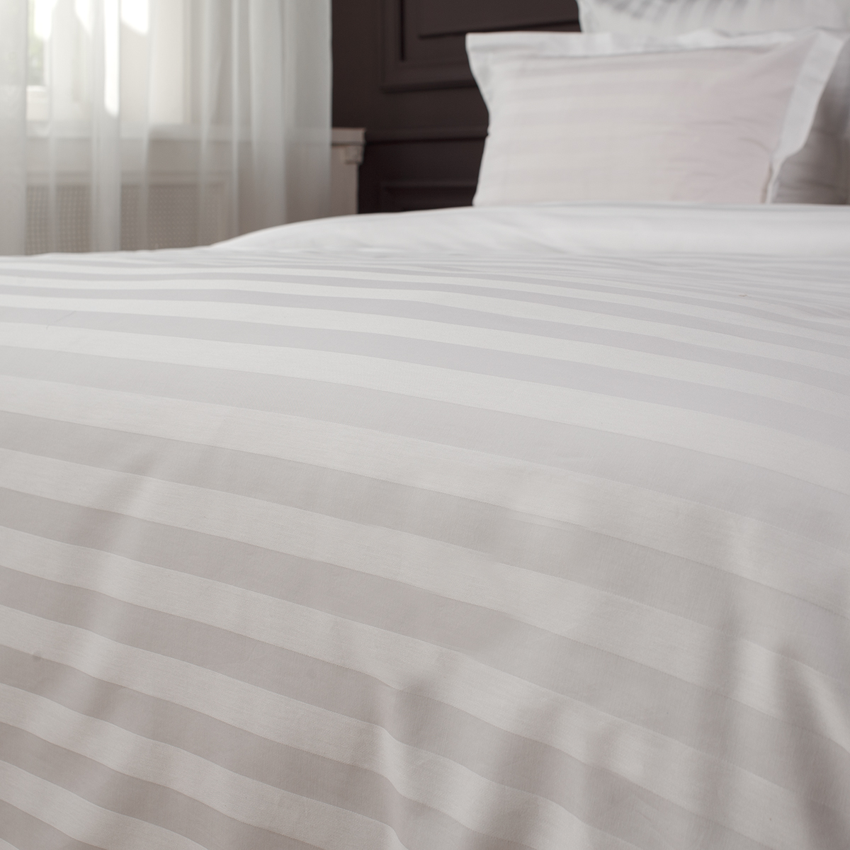 Однотонный стильный пододеяльник произведен из ткани страйп-сатин – 100% хлопок с жаккардовым рисунком в виде полос 3х3.